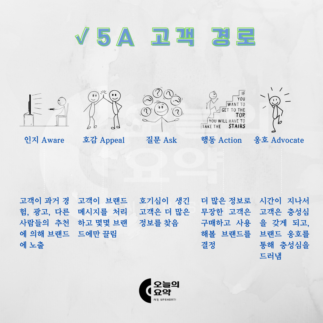 필립 코틀러는 이런 변화된 고객 행동을 설명하기 위해 5A(Customer Path: 5A) 모델을 제시했다. 이는 고객이 브랜드를 접한 후 구매까지 가는 과정에서 어떤 단계를 거치는지 구조적으로 보여준다.